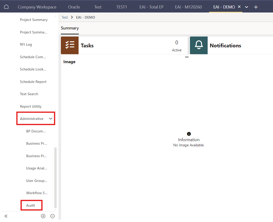 This will open up a subsection of reports, where you will again scroll to the bottom and click on Administrative. (Note: if you do not see this option, check that you have the proper permissions for this project shell.) Under Administrative, click Audit.