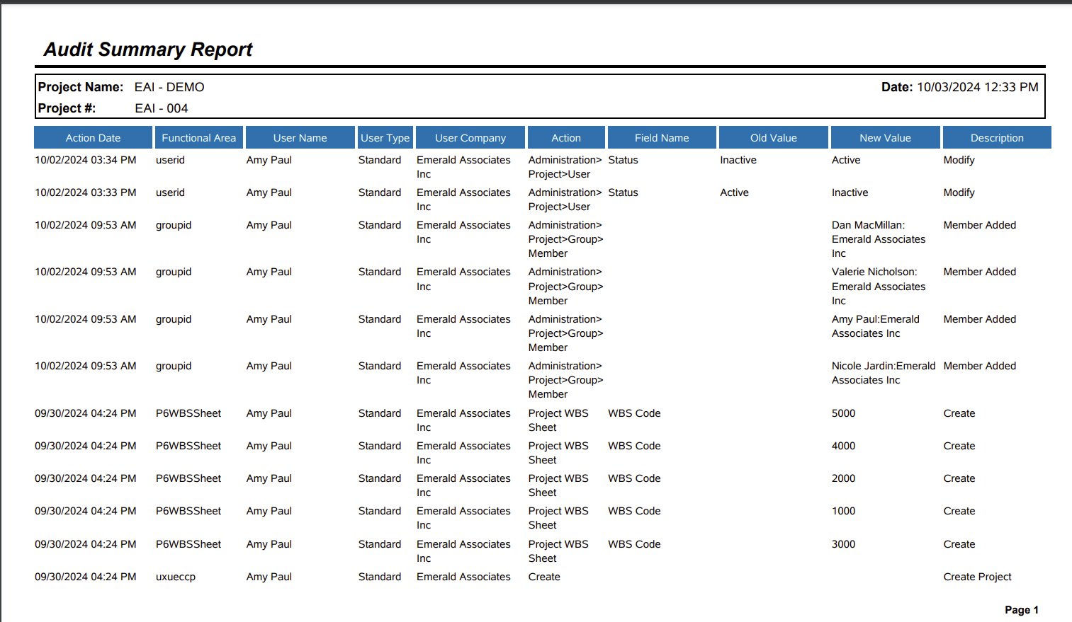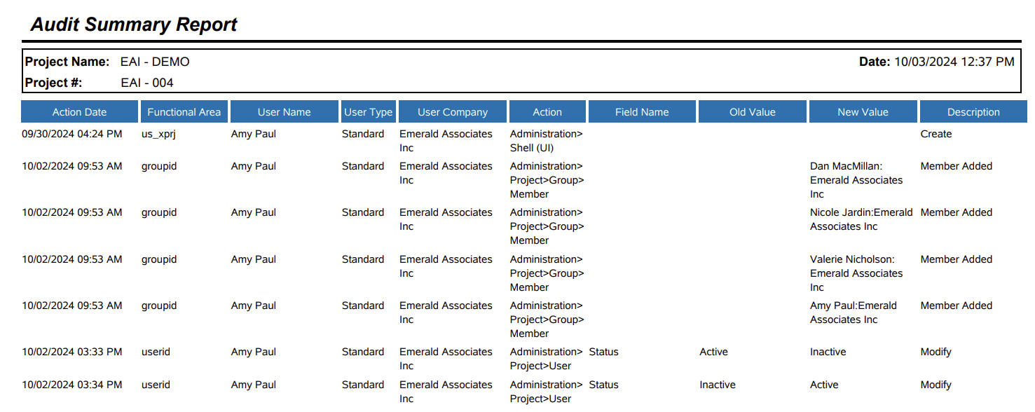 If you decide to leave the report blank, it will generate a full audit report on all available actions and changes that have been made in the project shell without any filters.