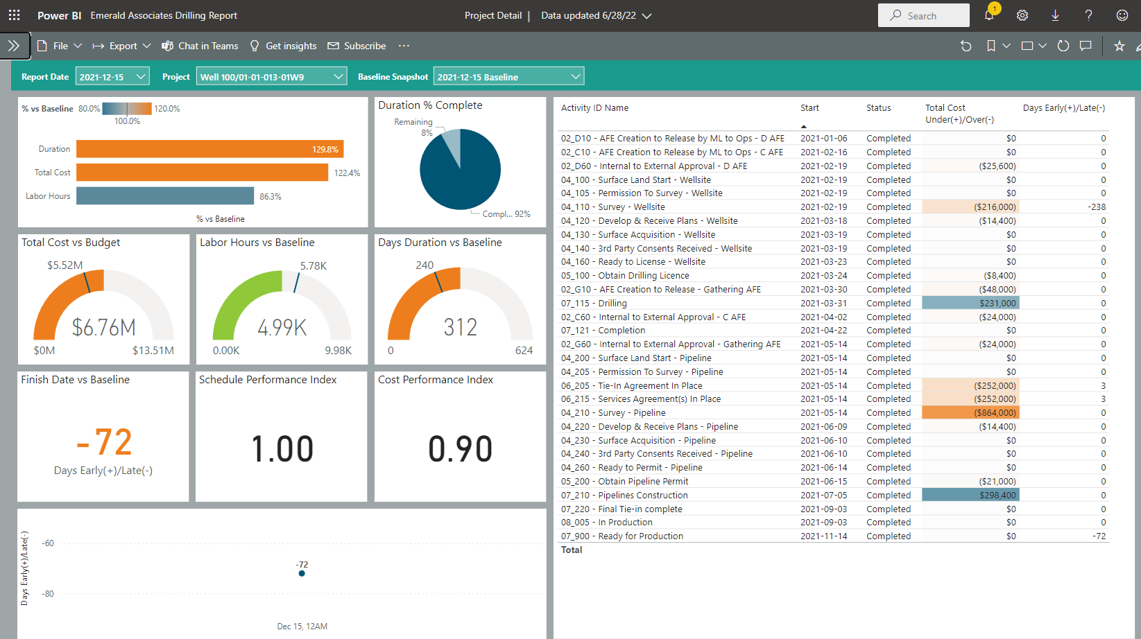 Project detail dashboard screen shot (above). Drill down dashboards for monitoring activities, labor hours, and costs are also available with P6-Reporter. From the Project Detail dashboard, quickly digest current project status information.