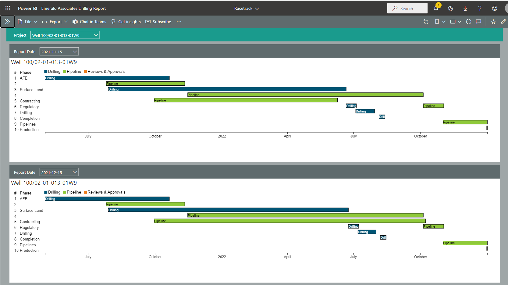 A screen shot of a racetrack report snapshot comparison above. A number of comparison report displays are available with self-serve filters and pick lists which allow focus on exactly the information you need to compare summarized to the level you require.