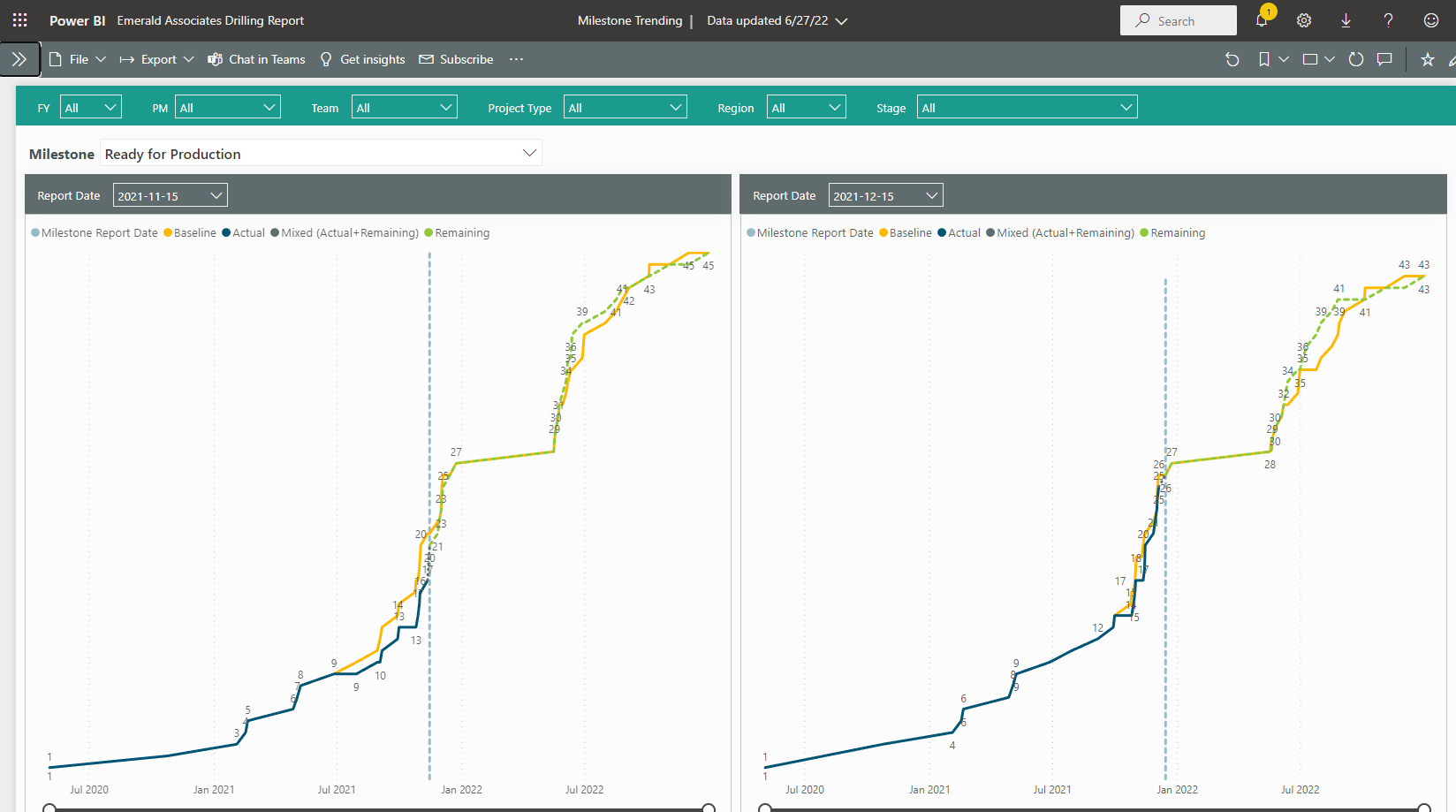 Milestone trending is also available using P6-Reporter. No more struggling with milestone reports of different levels or comparison display issues. Simply apply the required filters and make your selections from the picklists. The information from the snapshots feeds the report which displays automatically. At your fingertips, you have current information in an easy to digest format.