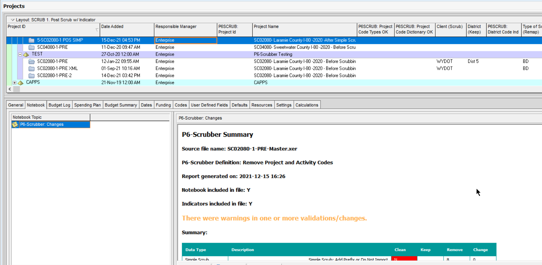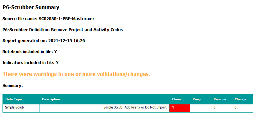 To scrub an XER/XML, you need to only choose a Scrubber Definition and one or many files to scrub. The P6-Scrubber will scrub each file according to the definition and supply an output of a clean file with an html report documenting everything the Scrubber did with the data. The report creation in the clean XER/XML file can be turned off if you do not want to include them in your import.