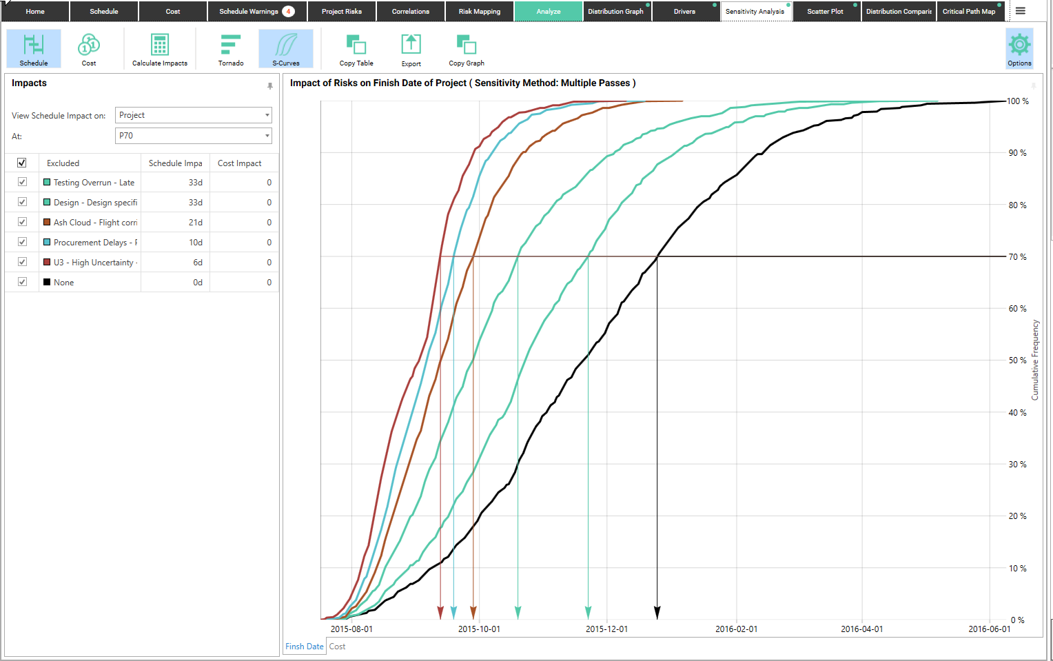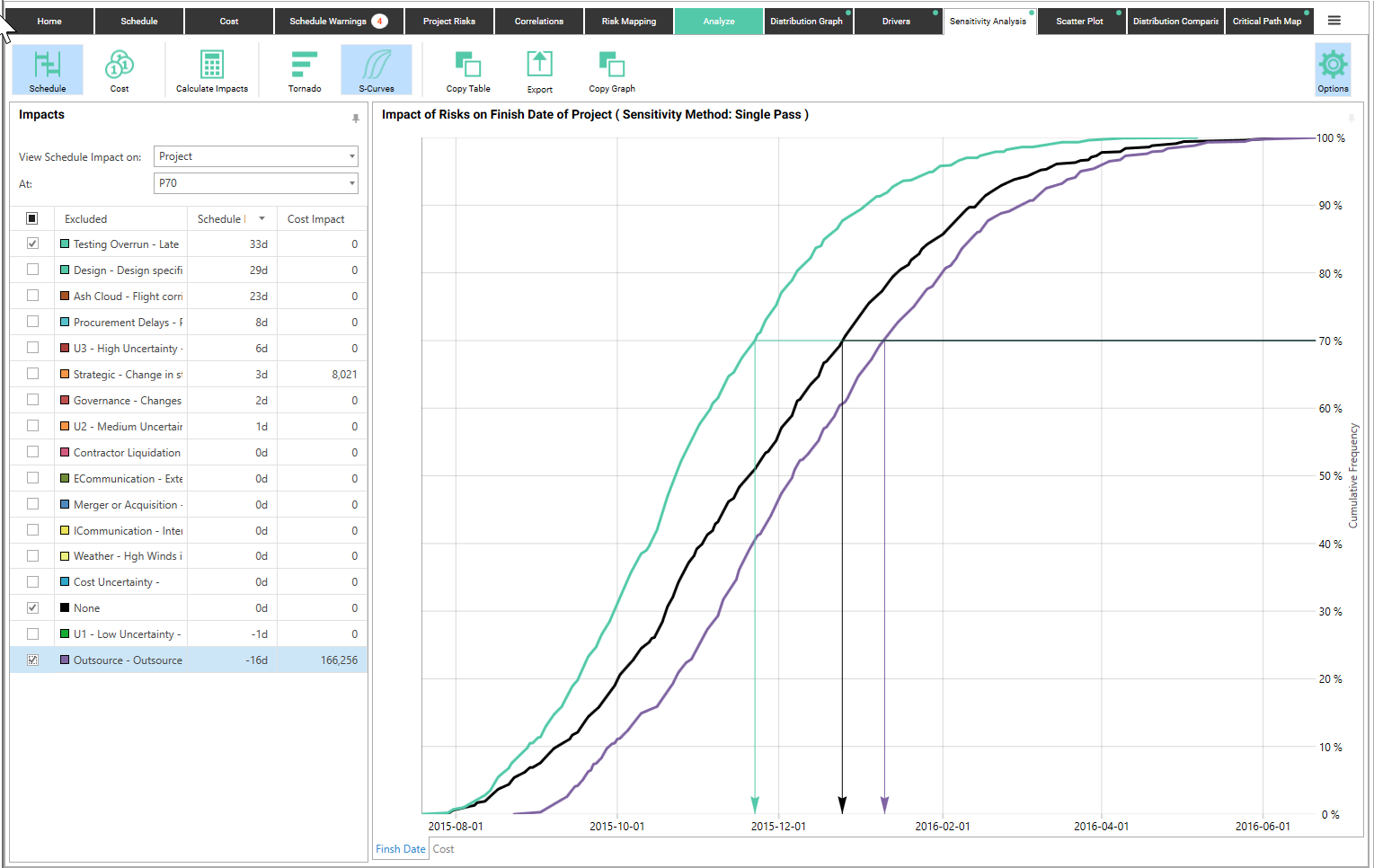 In this example, the black line represents all risks turned on (the “None” line) and the green line represents the same model with only the Testing Overrun risk turned off. This indicates that at P70, we would save 33 days if we could eliminate the Testing Overrun risk.