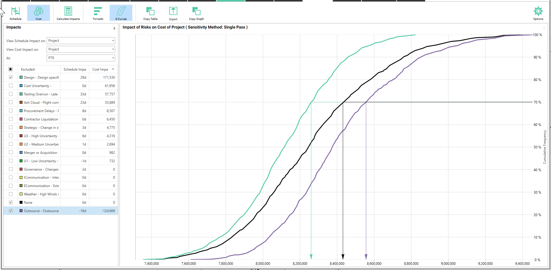 You can also see the effect of an opportunity in the purple line. The “Outsource” risk actually represents an opportunity. This shows that when the opportunity happens, the project duration is shorter (black line) than when the opportunity doesn't happen (purple line).