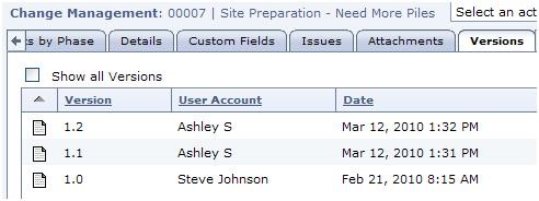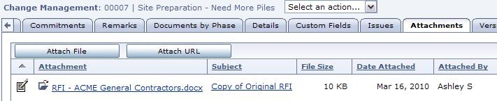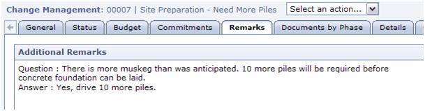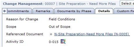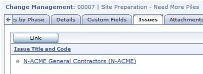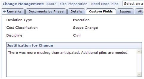 In the Commitments Tab, change documents affecting one or more of the commitment contracts can be created in each of the four phases. The General Tab provides a place to record basic Change Management information, such as number, date, title. The Version Tab holds all the recorded versions of the Change Management document. Versions can be recorded manually or they can automatically be recorded every time the document is modified and saved. This feature is new to Contract Management Release 13. In the Attachments Tab, associated URLs or documents can be attached, for example here the RFI that initiated the change is attached. The Status Tab has Priority and Status settings, as well as Ball in Court to draw a particular contact’s attention to the document. In the Budget Tab, change documents affecting the Budget can be created in each of the four phases. The Remarks Tab contains information from the document that initiated Change Management, in this case a Request for Information with a Question and Answer. Links to each of the phases of the change process are available in the Documents by Phase Tab. The Details Tab contains a link back to the document that initiated Change Management. The Change Management document can also be linked to an Activity from the P6 schedule for reference. Custom Fields allow you to track any type of information that you may need. Various types of data fields can be used, and pick lists can be used to validate data that is entered. An unlimited number of Issues can be linked to each Change Management document. An issue is like a virtual file folder holding links to each document related to a particular subject, work package or issue.
