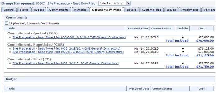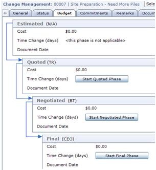 The Change Management module is a central location where the entire history of a change is recorded, from initial estimate to final Change Order approval. The change process for both budget and commitments is reflected in Change Management, and each side has four distinct phases to match business processes: estimated, quoted, negotiated and final.