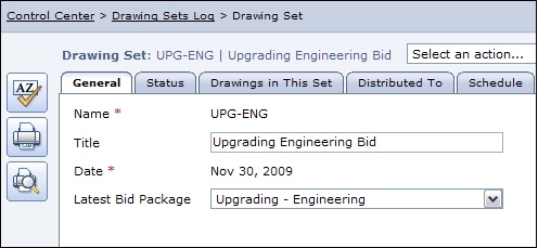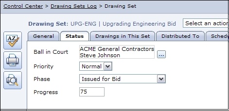 The General Tab provides a place to record basic information about the Submittal Package, such as the Title and the Contract it is associated with. The Status Tab is where responsibility and priority are assigned. The Submittal Package Status can be set and information about included Submittals is shown. A Workflow Template can be set up for Submittal transfers and revisions. This Template will be copied into the Submittals created for this Submittal Package. Submittal Packages can be linked in to Issues.