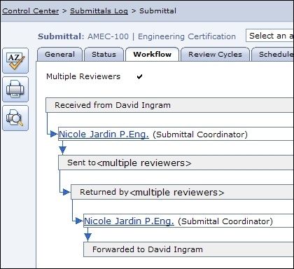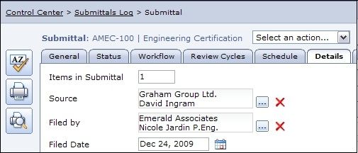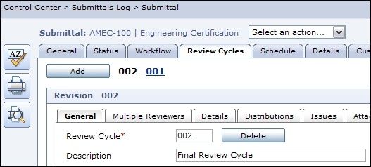 The Submittal log screen shows information about each Submittal and its Status. The log screen can be customized to display various information about each Submittal. The General Tab provides a place to record basic information about the Submittal, such as the Package it's included in, the Number and Title and the Category and Type of Submittal. The Status Tab is where responsibility and priority are assigned. The Workflow for Submittal transfers and revisions can be copied from the Template or modified to reflect the needs of each Submittal. Contract Management allows for tracking approval from multiple reviewers. Multiple Review cycles can be recorded in Contract Management for each Submittal. Information and transfer dates are recorded for each revision, along with the Status. During each Review Cycle, multiple Reviewers can be tracked in Contract Management along with the Status they assign to the Submittal. Attachments can be added to each Submittal or to each Review Cycle. A new Review Cycle. The Schedule section, which allows for a link to the Primavera Schedule to retrieve dates, makes it possible to calculate the dates when each step of the Submittal Process must start and finish in order to have the Submittal Approved on time. Submittal Details are tracked.