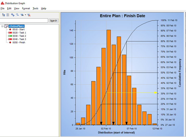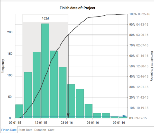 - After risk analysis, the Distribution Graph appears on screen. The graph provides a statistical breakdown of the project durations and finish dates generated during the analysis.