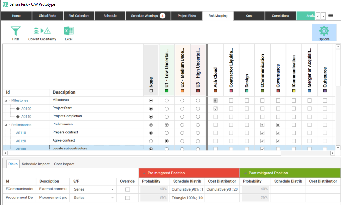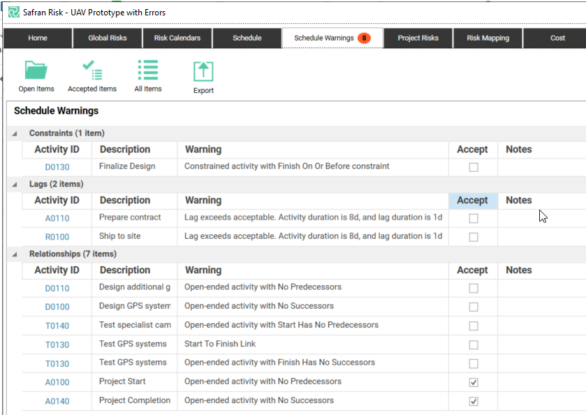 - Safran Risk provides Schedule Warnings that help get a user’s schedule ready for risk analysis.
