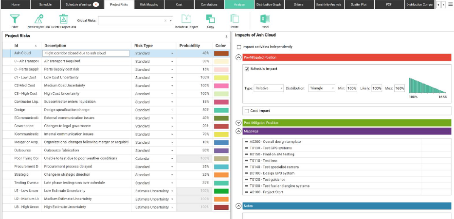 - View overall duration distribution diagrams for an activity. Risks can be removed or added to see immediately how risks impact the activity.s.