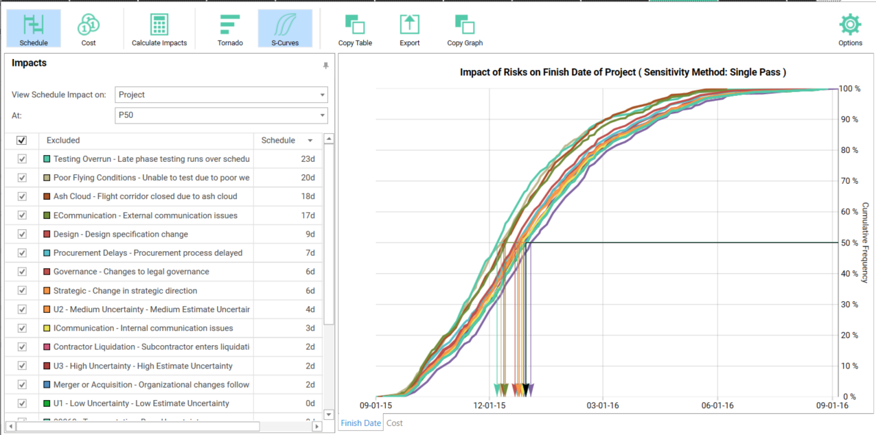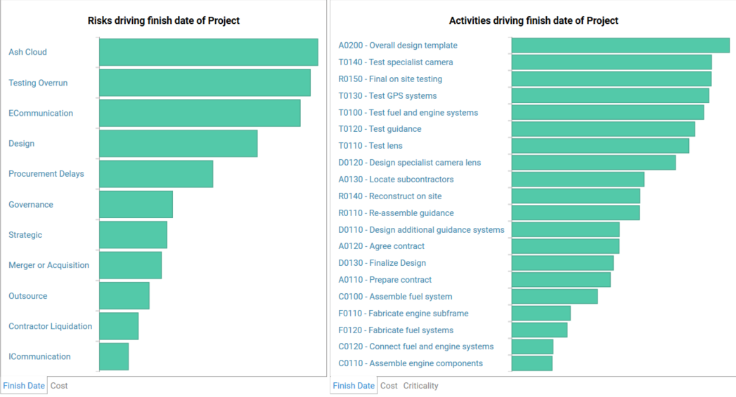 - Risk Drivers (Tornado Charts) highlight where mitigation energy should be focused. Optionally, a user can choose individual activity results.